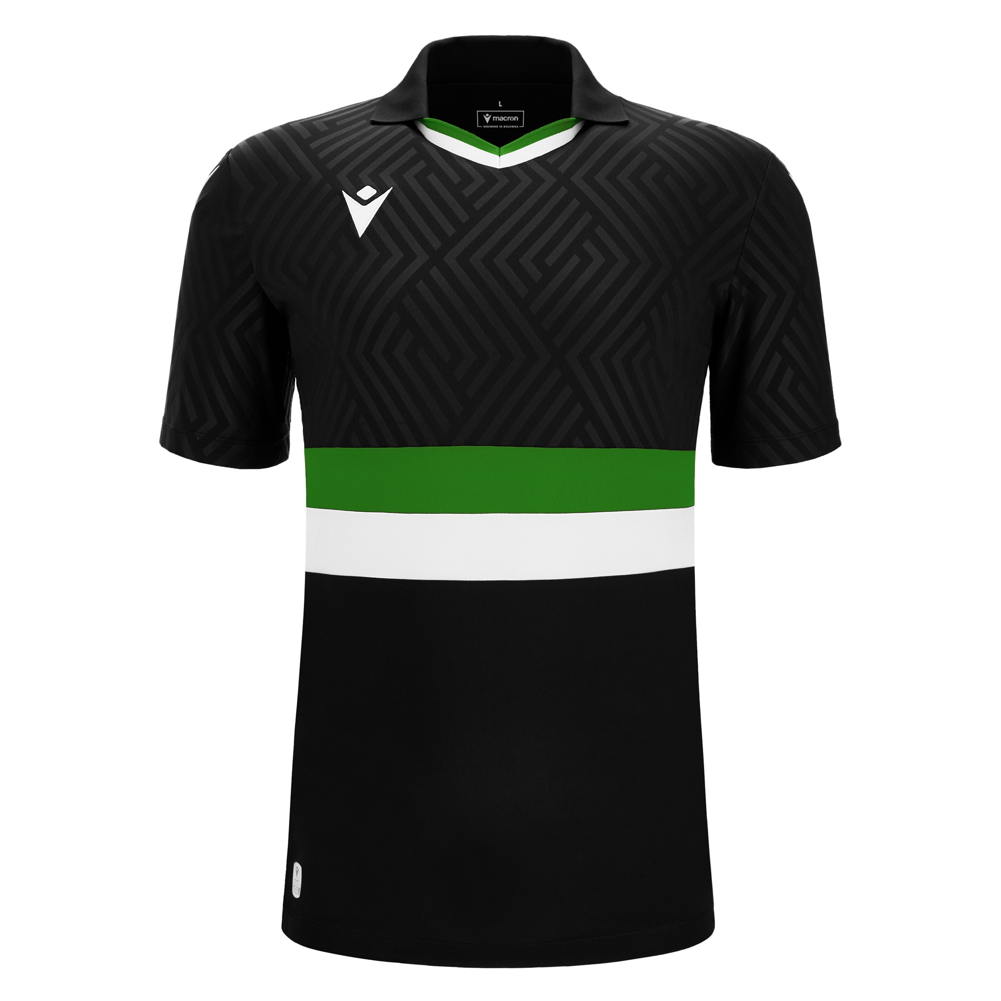 Trikot mit vollständiger Fertigung aus Eco-Fabric, zu 100% aus recyceltem PET. Der Kragen im Poloshirt-Stil aus Strick bietet einen zweifarbigen V-Ausschnitt ebenfalls aus Strick. Das Trikot ist durch ein eingesetztes zweifarbiges zentrales Band und eine spezielle geprägte Textur im oberen Brustbereich und an den Ärmeln gekennzeichnet. Die Rückseite aus Eco-Mikro-Mesh garantiert eine optimale Atmungsaktivität.