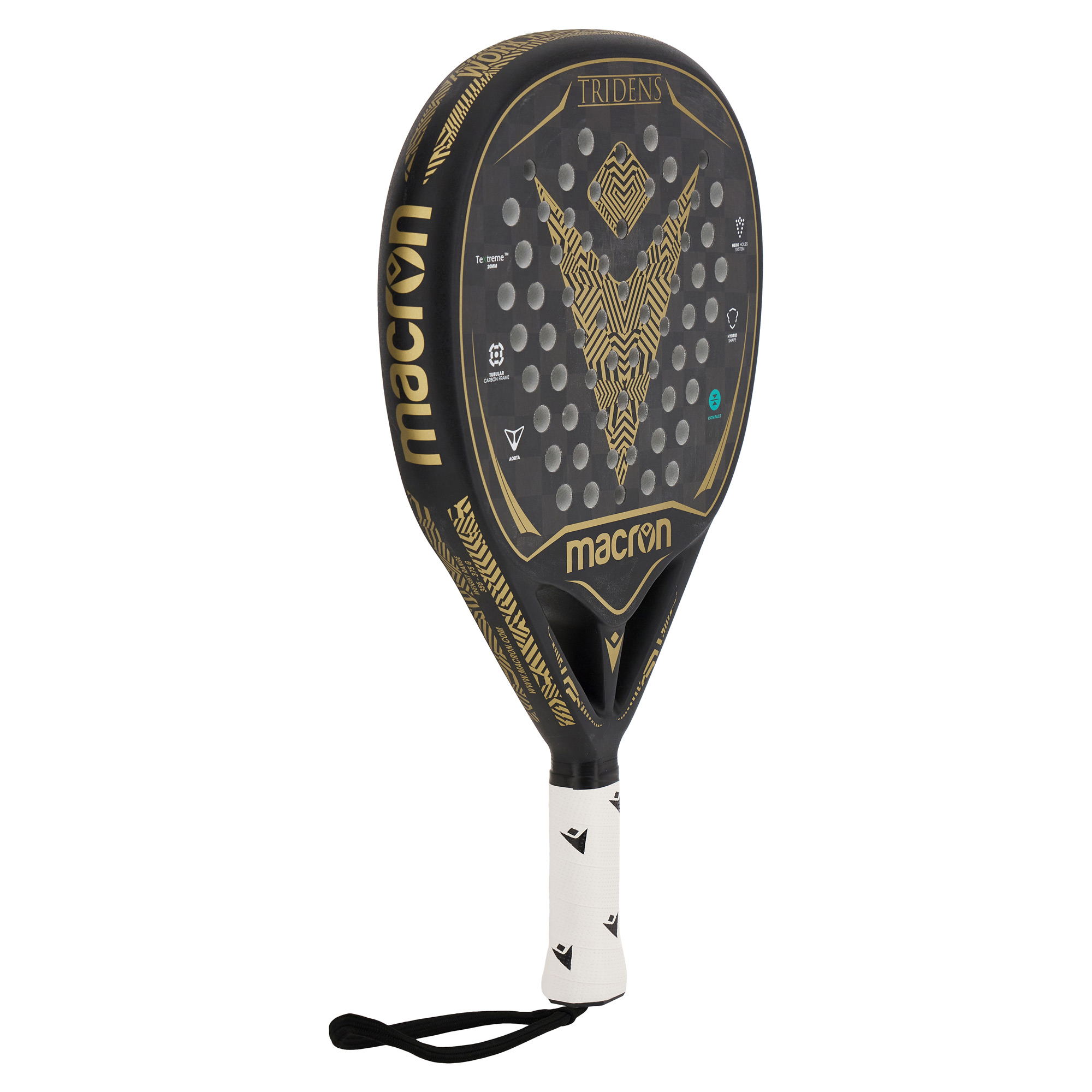 Macron präsentiert den Padelschläger Tridens Pro Racket. Mit seinem eleganten, auf die Farbtöne Gold und Schwarz aufbauenden Design ist Tridens das ideale Gerät für starke Spielerinnen und Spieler, die beim Schlag alles unter Kontrolle haben möchten.