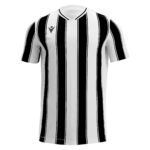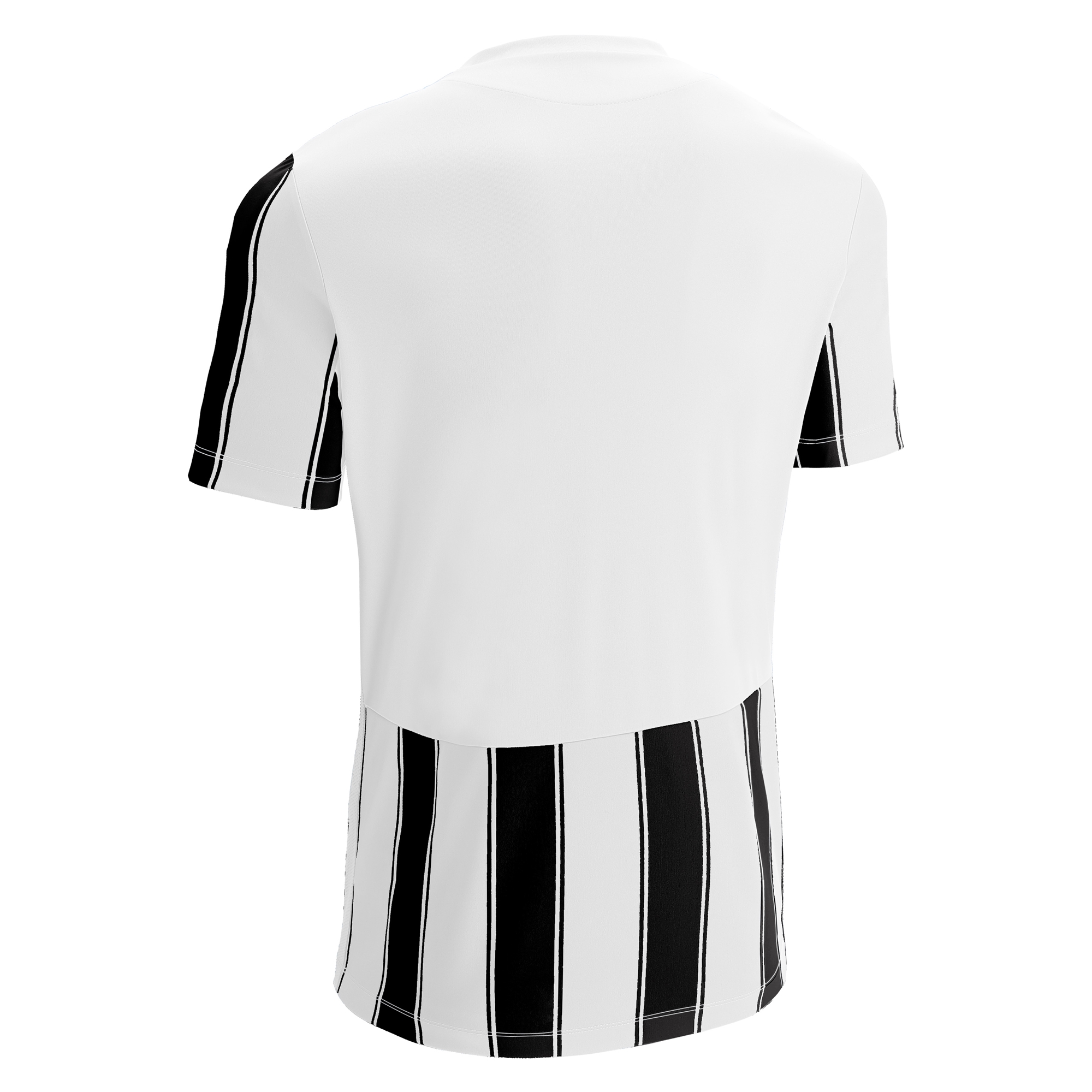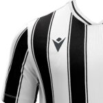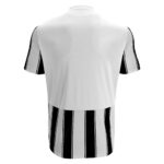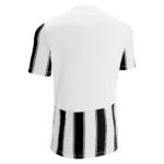 Fußballtrikot aus 100 % Polyester-Interlockgewebe. V-Ausschnitt aus Strick und Hinterkragen aus Hauptstoff. Mesh-Seiteneinsätze für Atmungsaktivität und Tragekomfort. Streifenmuster hinten mit Aussparung für die Rückennummer.