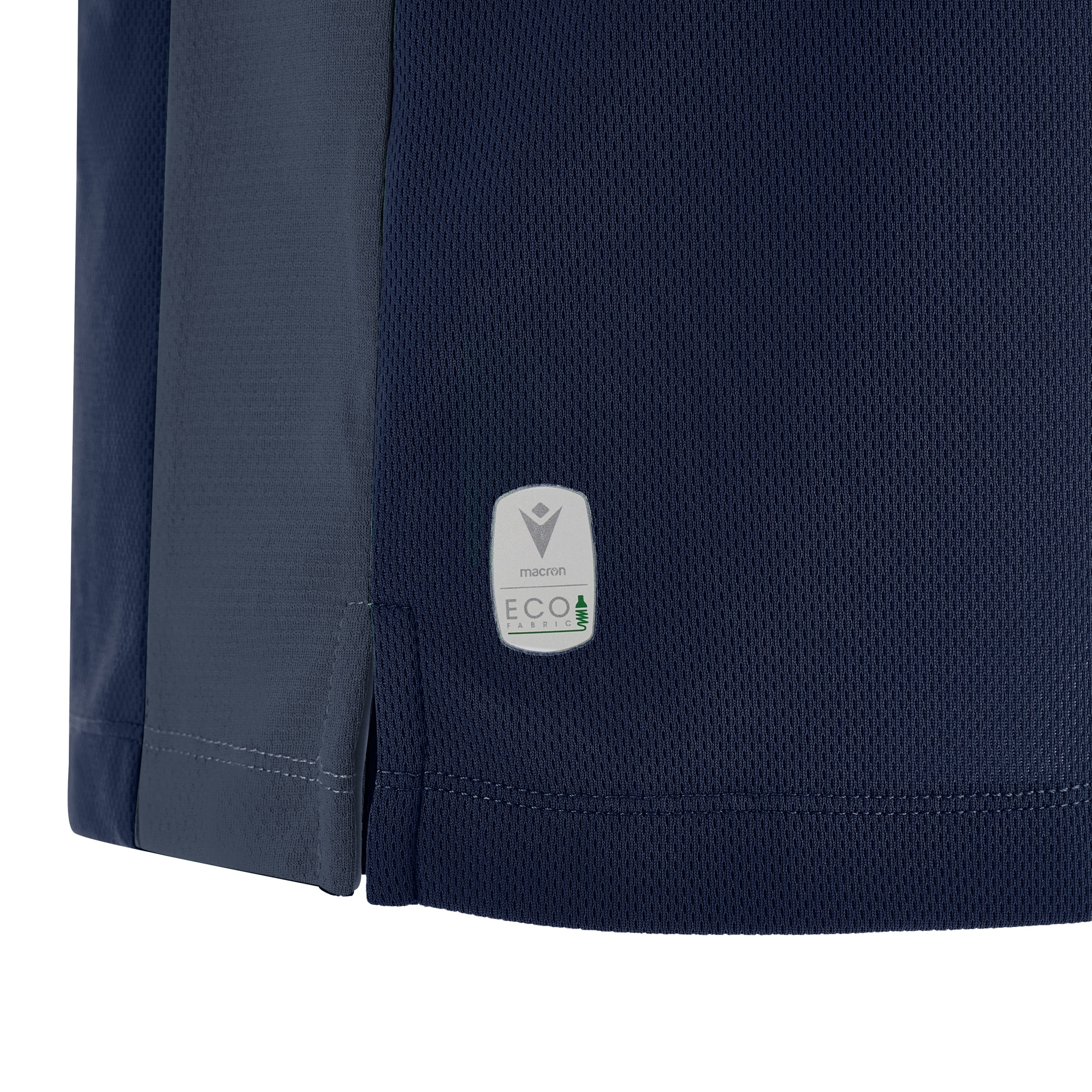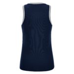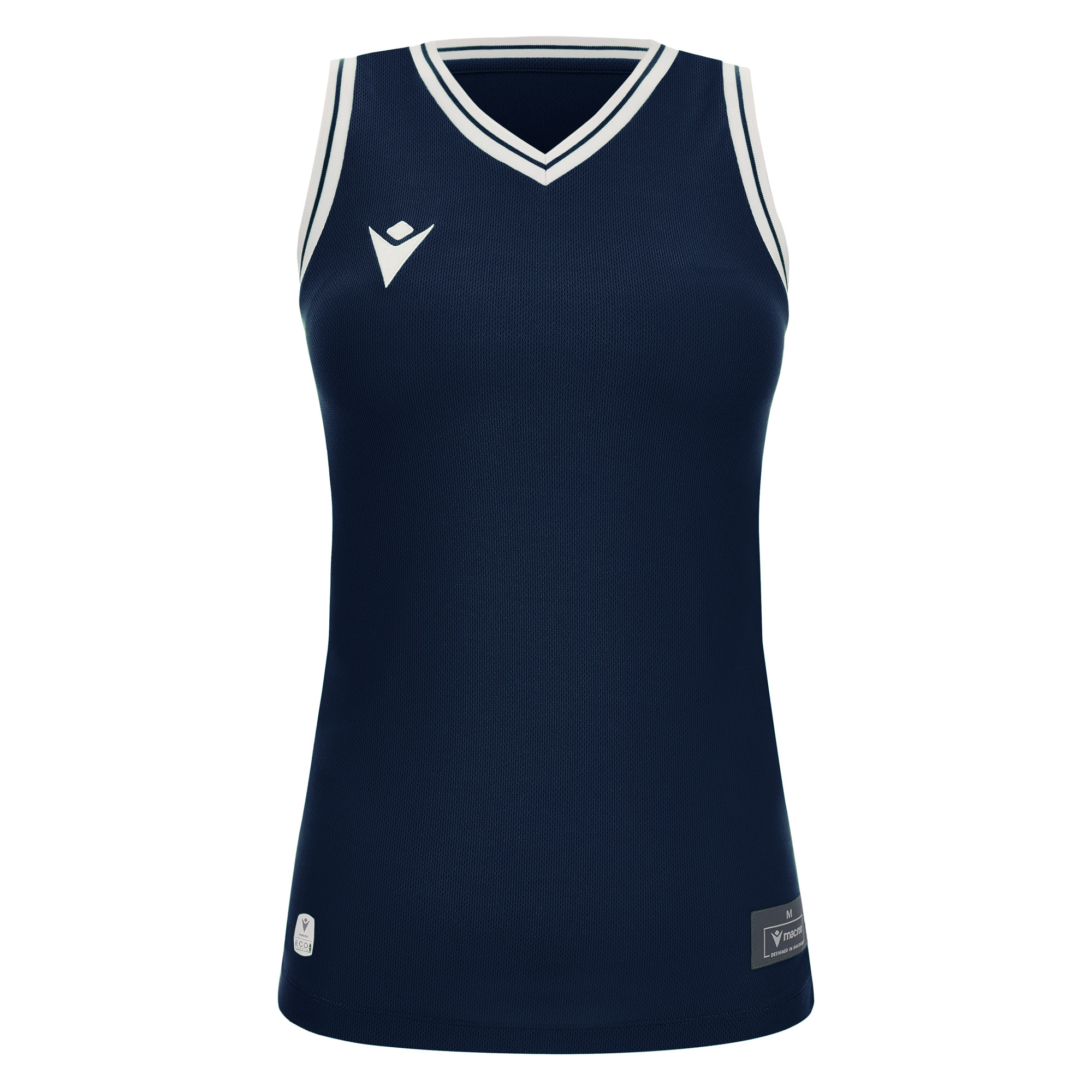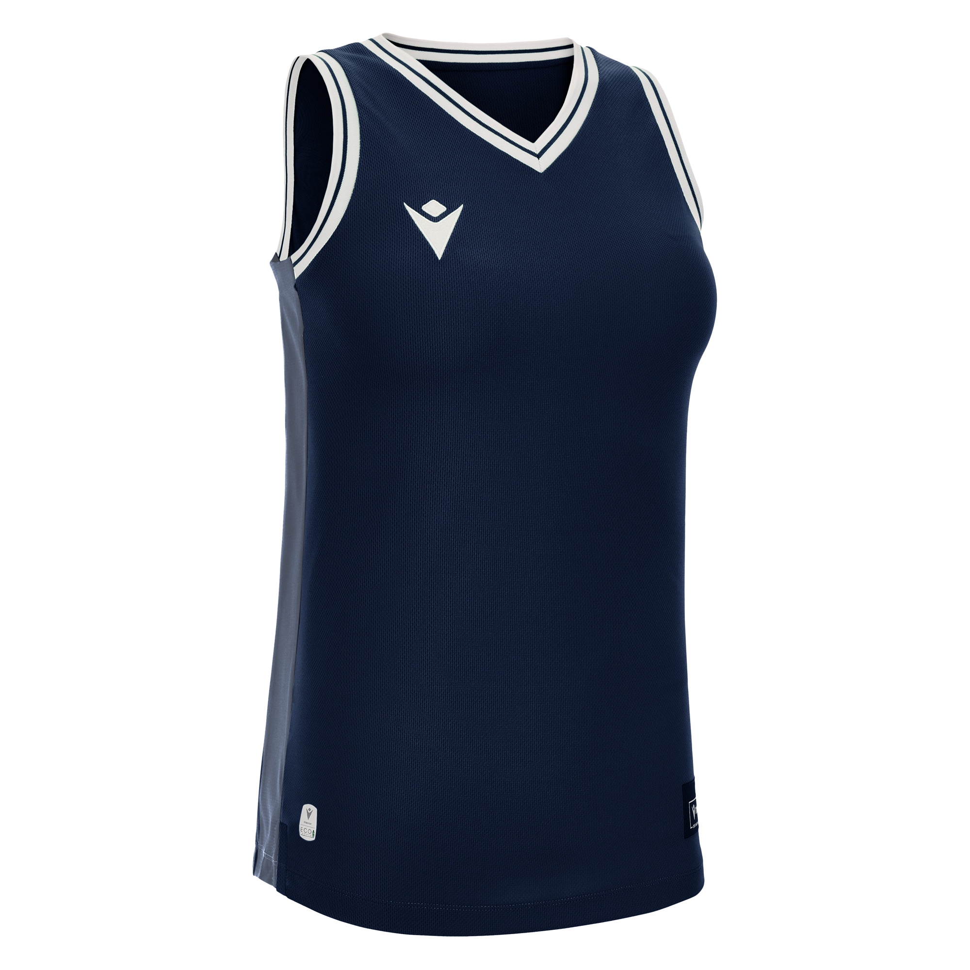 Ärmelloses Damen-Trikot mit schmaler Schulter aus Eco-Fabric, zu 100% aus recyceltem PET. Der V-Kragen und die Armausschnitte sind aus zweifarbigem Strick gefertigt, die seitlichen Einsätze dagegen aus Eco-Mesh, um die Atmungsaktivität zu optimieren.