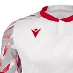 Trikot mit vollständiger Fertigung aus Eco Fabric, zu 100% aus recyceltem PET. Der Stehkragen aus Strick wird durch zwei Druckknöpfe geschlossen. Das Trikot bietet eine geprägte Textur an der Vorderseite und sublimiertes Design auf den Ärmeln. Die Kragenrückseite und der untere Saum sind aus Eco-Mesh, die Trikot-Rückseite aus Eco-Mikro-Mesh, um die Atmungsaktivität zu optimieren.